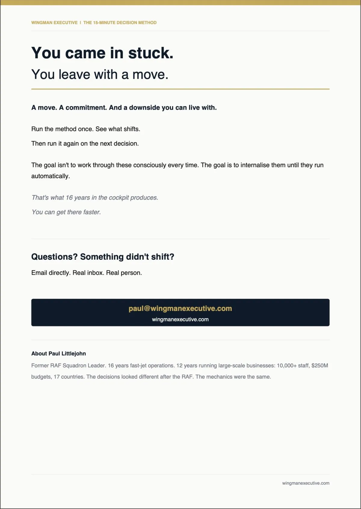 Because the cockpit is the highest-pressure decision environment there is. No time. Incomplete information. Real consequences. 16 years of that gets wired in. Then 12 years applying it at scale in business confirmed it transfers. You don't have to trust me. Run the framework and judge it yourself.